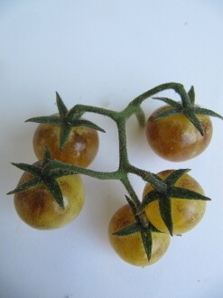 Eine der besten Tomaten überhaupt, sehr guter tomatiger Geschmack. Gelb mit lila Färbung oben, von den Blättern gibt es einen sternförmigen Abdruck, eine richtige Schönheit.