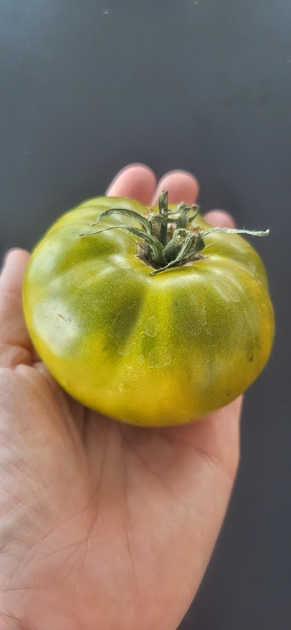 Eine Ananas Tomate in grün, zumindest äusserlich. Innen zeigt sie ein schönes rot. Reift eher spät aus und ergibt grosse Pflanzen.