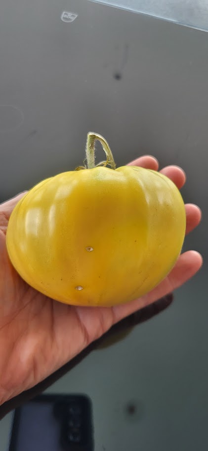 Eine Ochsenherz, aber in gelb!  Gelbe Sorten haben weniger Säure und sind mild im Geschmack, aber auch wirklich toll. Eine eher seltene Sorte aus Russland.