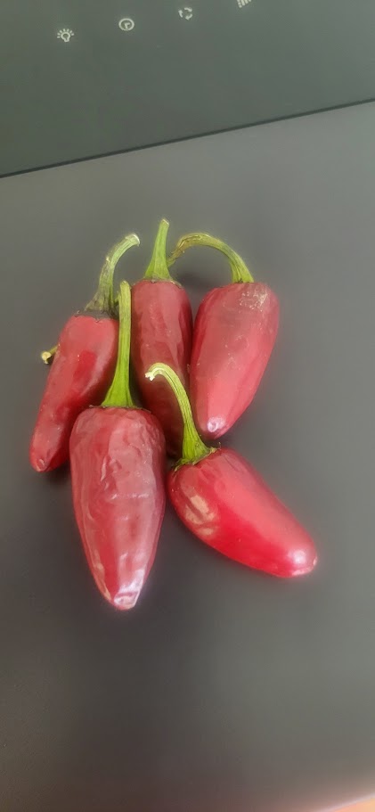 Sieht ein wenig wie eine Jalapeno aus und ist relativ mild mit einer Schärfe von 4. Wächst unkompliziert etwas 50 cm hoch und trägt gut. Hier könnte ihr Pulver für Raclette oder Saucen machen, und bestimmt kann man die auch gut frisch ins Gulasch geben oder eine Salsa. Die Farbe ist etwas heller als auf dem Foto!