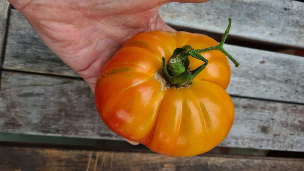 Mittelgrosse und plattrunde Früchte, süss und fruchtig. Es ist eine Buschtomate die doch recht grosse Früchte trägt und eine tolle Farbe hat.